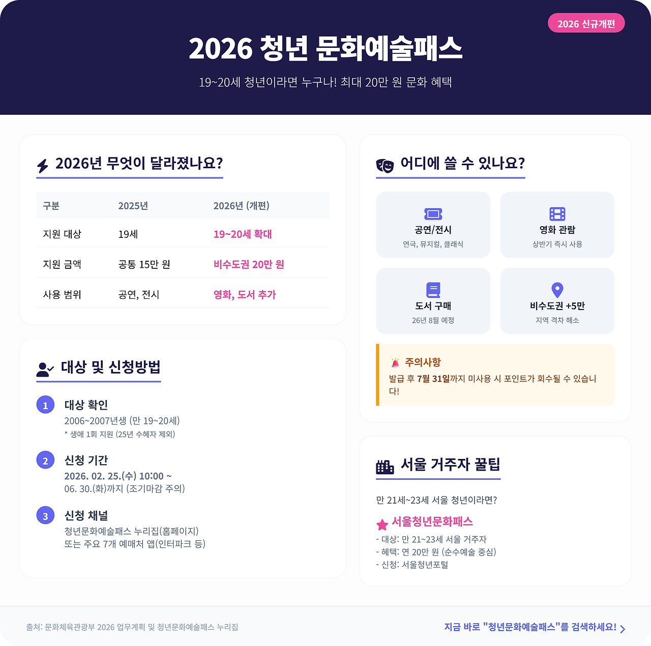 이번 글에서는 청년문화예술패스 신청 대상부터 신청 방법, 받을 수 있는 혜택, 사용처, 그리고 꼭 알아야 할 꿀팁까지 한 번에 정리해본다.